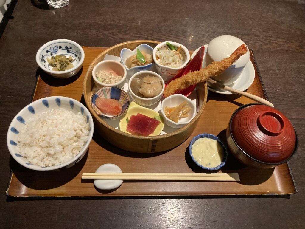 海老フライ おかず各種 茶碗蒸し ご飯 味噌汁 漬物