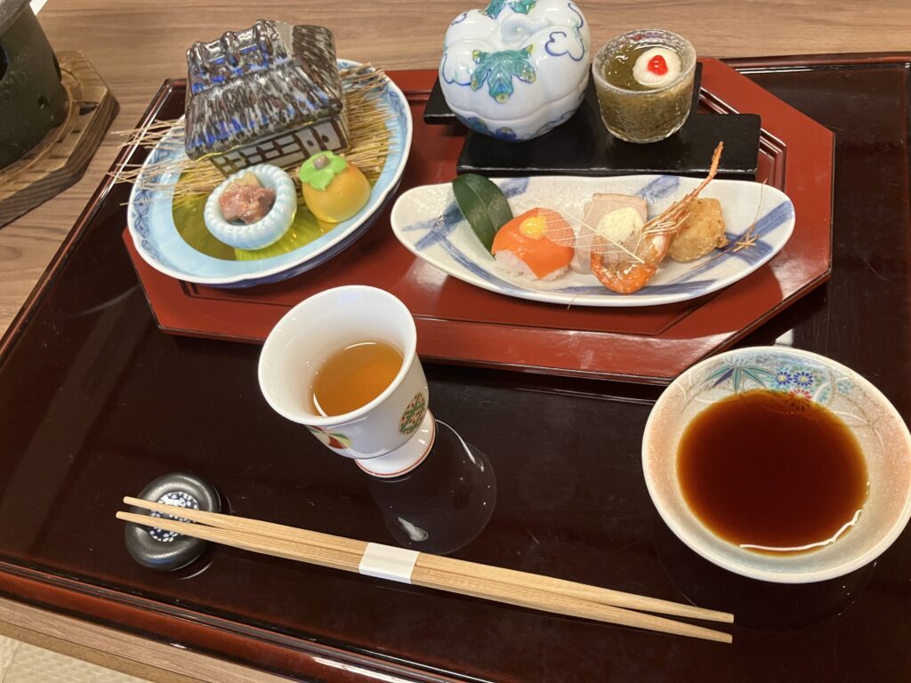 右手は楽盛り(山茶花寿し・合鴨トリュフチーズ・糸水雲・石川県復興蟹かま、他)