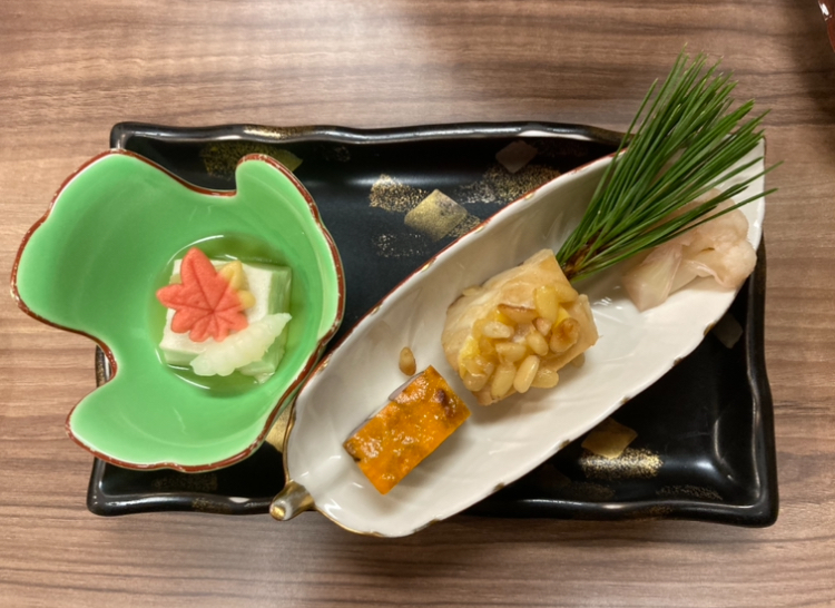 丹那牛乳の胡麻豆腐・零余子新蒸うに焼・鰈松の実焼・カリフラワー梅酢漬