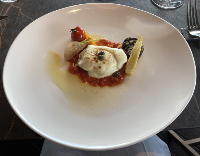 グリルしたカブ、ミニトマトとナス、ヤングコーンが添えられた