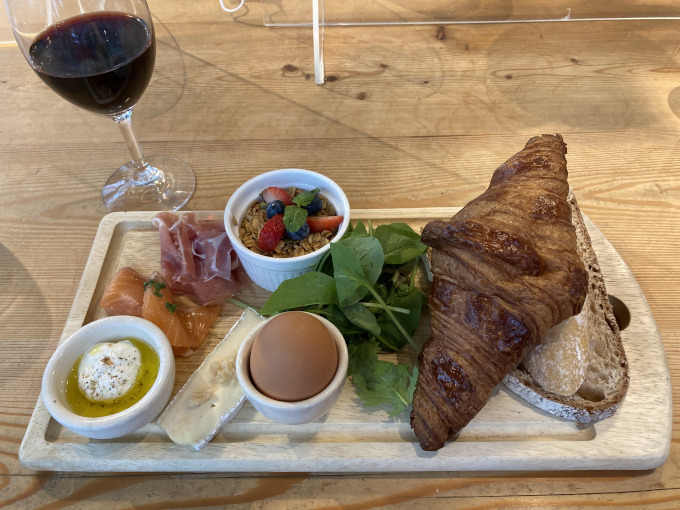 スモークサーモン、ハモンセラーノ、ブリーチーズ、リコッタチーズ、ミニグラノラパフェ、ソフトボイルドエッグ、ブレッド、オーガニックオレンジジュース