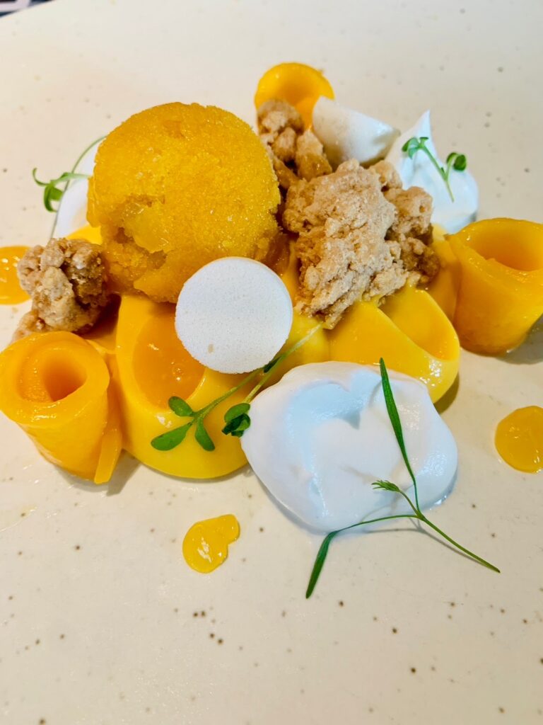 マンゴー味のシャーベット、マンゴー果実がたっぷりで、マンゴー好きに大好評のデザートです🥭