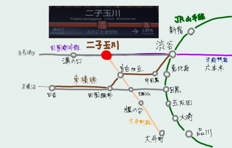渋谷駅から 東急田園都市線 急行利用 →二子玉川駅