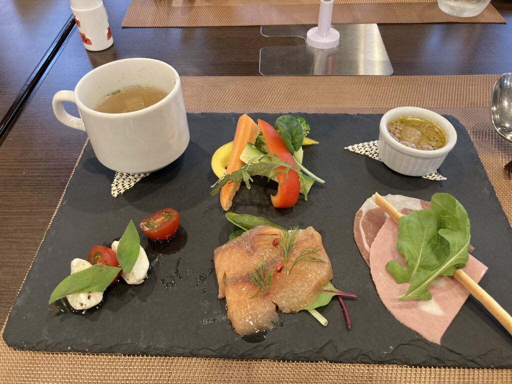 コンソメスープ、彩り野菜とバーニャカウダ、ミニトマト&ハーブ&モッツァレラチーズ