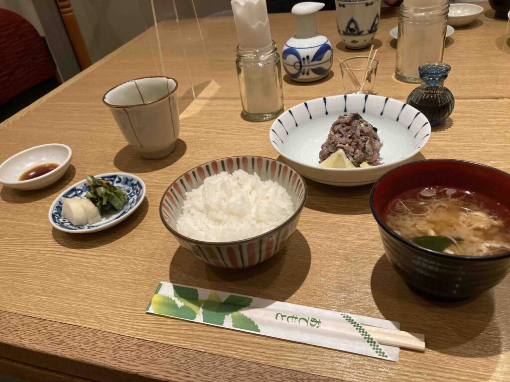 お漬物、ご飯、鰯のたたき、豆腐の味噌汁